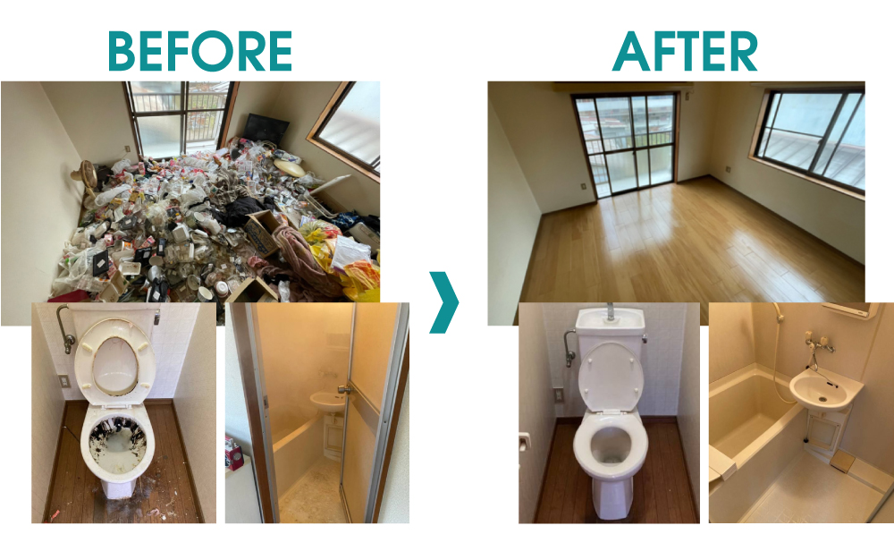 | 状況説明 | 部屋一面に天井まで届きそうなゴミの量で、衛生環境もひどく害虫が大量発生していました。そのため基本の清掃にプラスして、部屋の脱臭や害虫駆除も必要でした。家電のリサイクル処分までを含めての金額です。 |